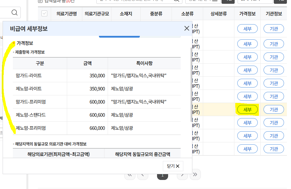 원하는 병원의 가격정보의 세부를 누르면 니프티 검사비가 상세히 표시됩니다.