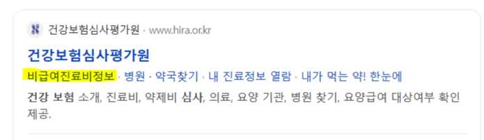건강보험심사평가원 사이트 오른쪽 상단에 '비급여 진료비용 정보' 선택